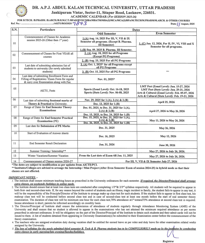 डॉ. ए.पी.जे. अब्दुल कलाम तकनीकी विश्वविद्यालय (AKTU), उत्तर प्रदेश ने सत्र 2025–26 के लिए आधिकारिक एकेडमिक कैलेंडर जारी कर दिया है। यह कैलेंडर बी.टेक, बी.फार्मा, बी.आर्क, BHMCT, BFAD, BVoc, MCA, MBA, MTech, MPharm, MArch और अन्य कोर्सेज पर लागू होगा। अगर आप AKTU से जुड़े छात्र हैं या नए एडमिशन लेने वाले हैं, तो ये तारीखें आपके लिए बेहद महत्वपूर्ण हैं। आधिकारिक नोटिस AKTU की वेबसाइट पर उपलब्ध है, लेकिन हमने यहां आपके लिए आसान भाषा में पूरा सारांश दिया है।