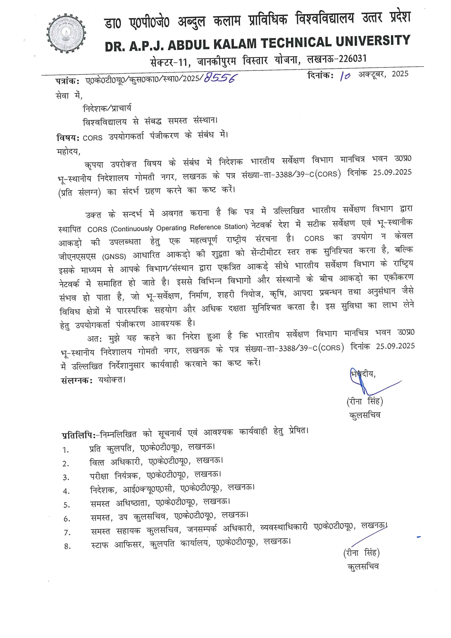 In the circular, Ms. Reena Singh (Registrar, AKTU) stated that all affiliated institutions must act as per the Survey of India’s directions and complete the CORS User Registration process at the earliest.