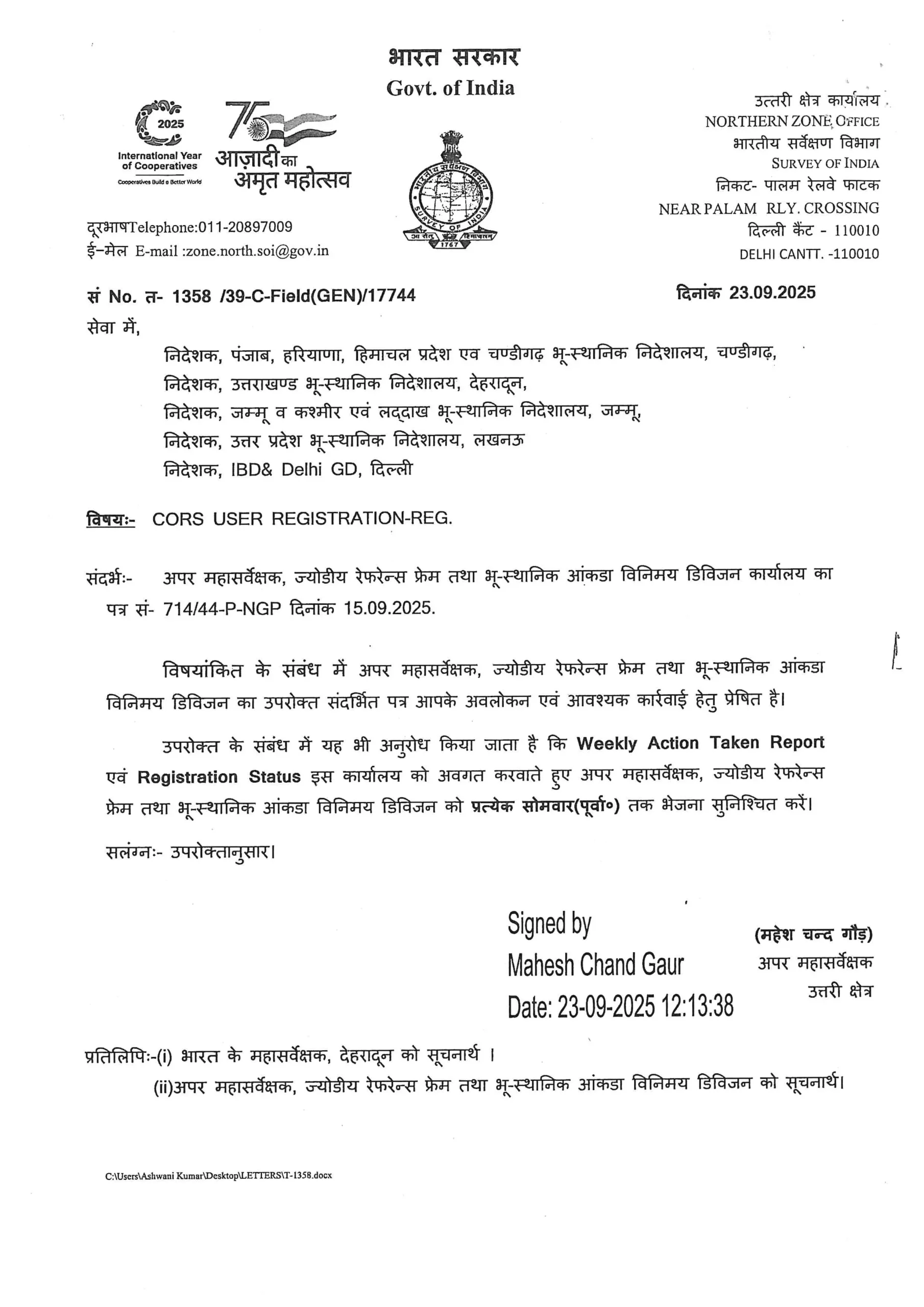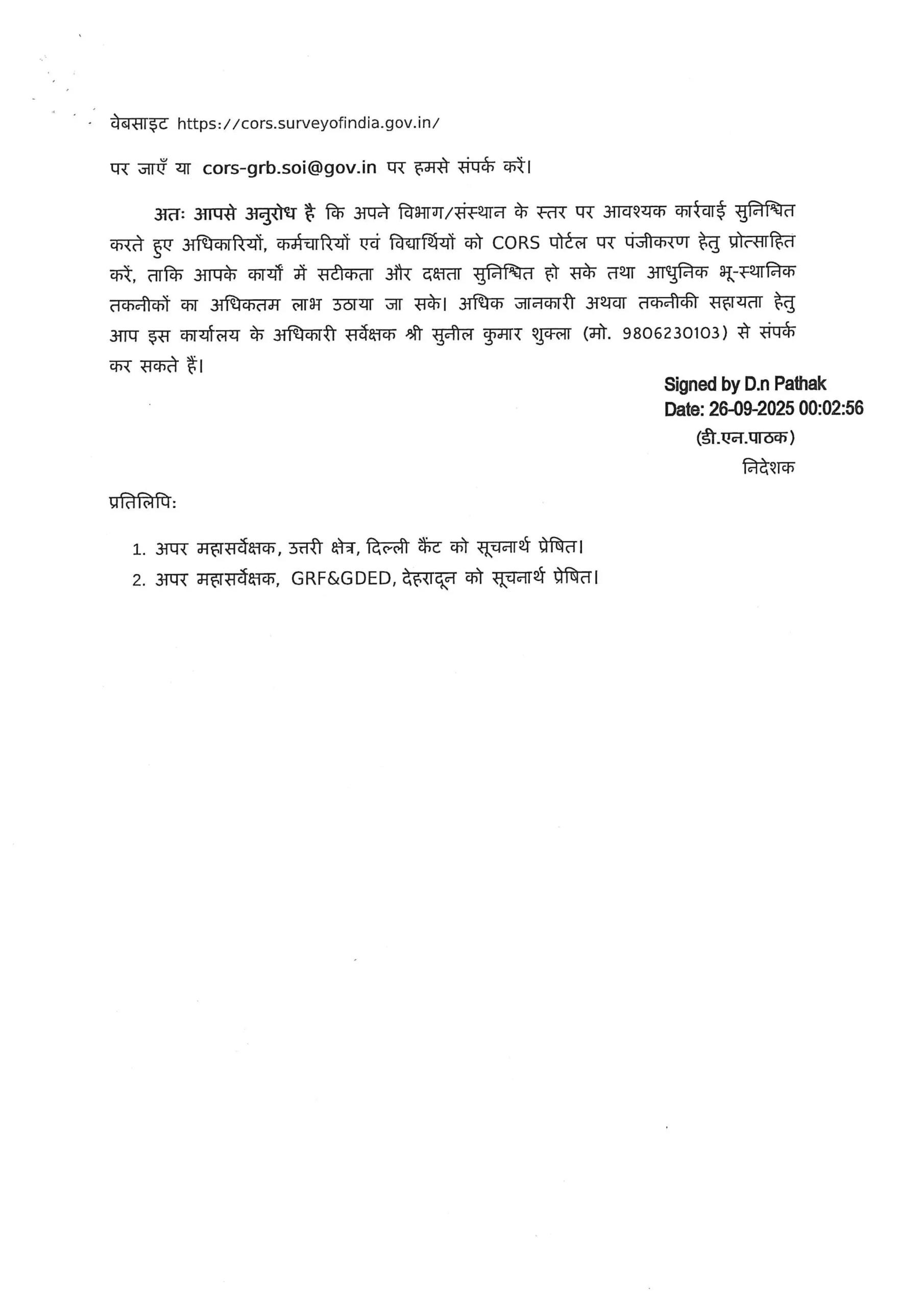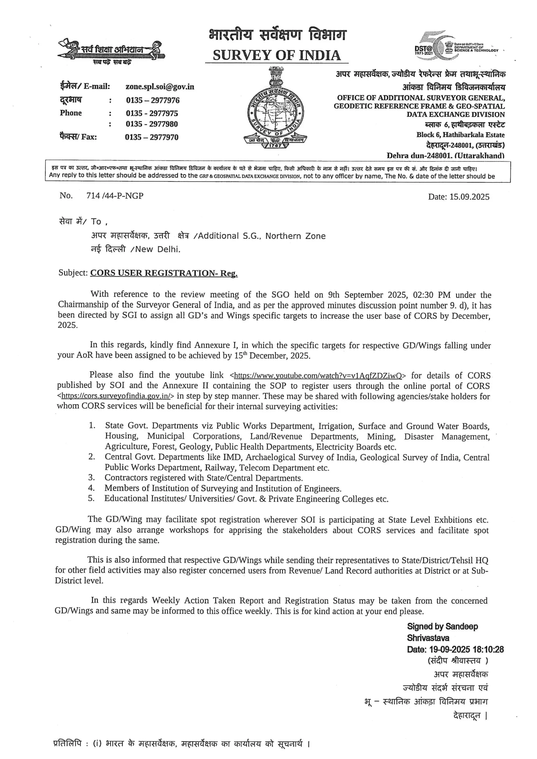 Reference | Survey of India Letter No. TA-3388/39-C (CORS), dated 25.09.2025 |
