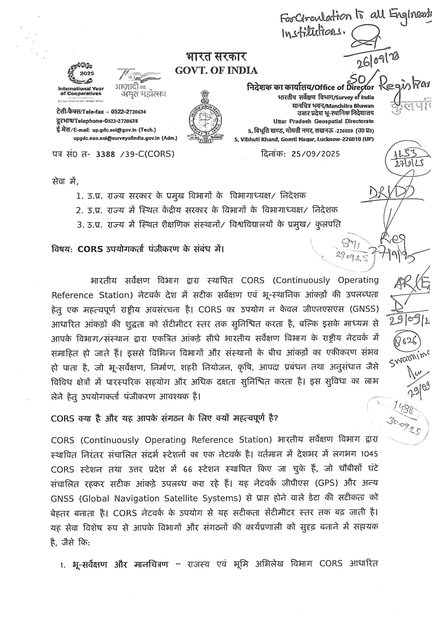 This important notification (Letter No. AKTU/KUS.KA./Sth./2025/8556, dated 10 October 2025) directs all affiliated institutes to complete their CORS (Continuously Operating Reference Station) user registration as per the instructions of the Survey of India, Lucknow Directorate.