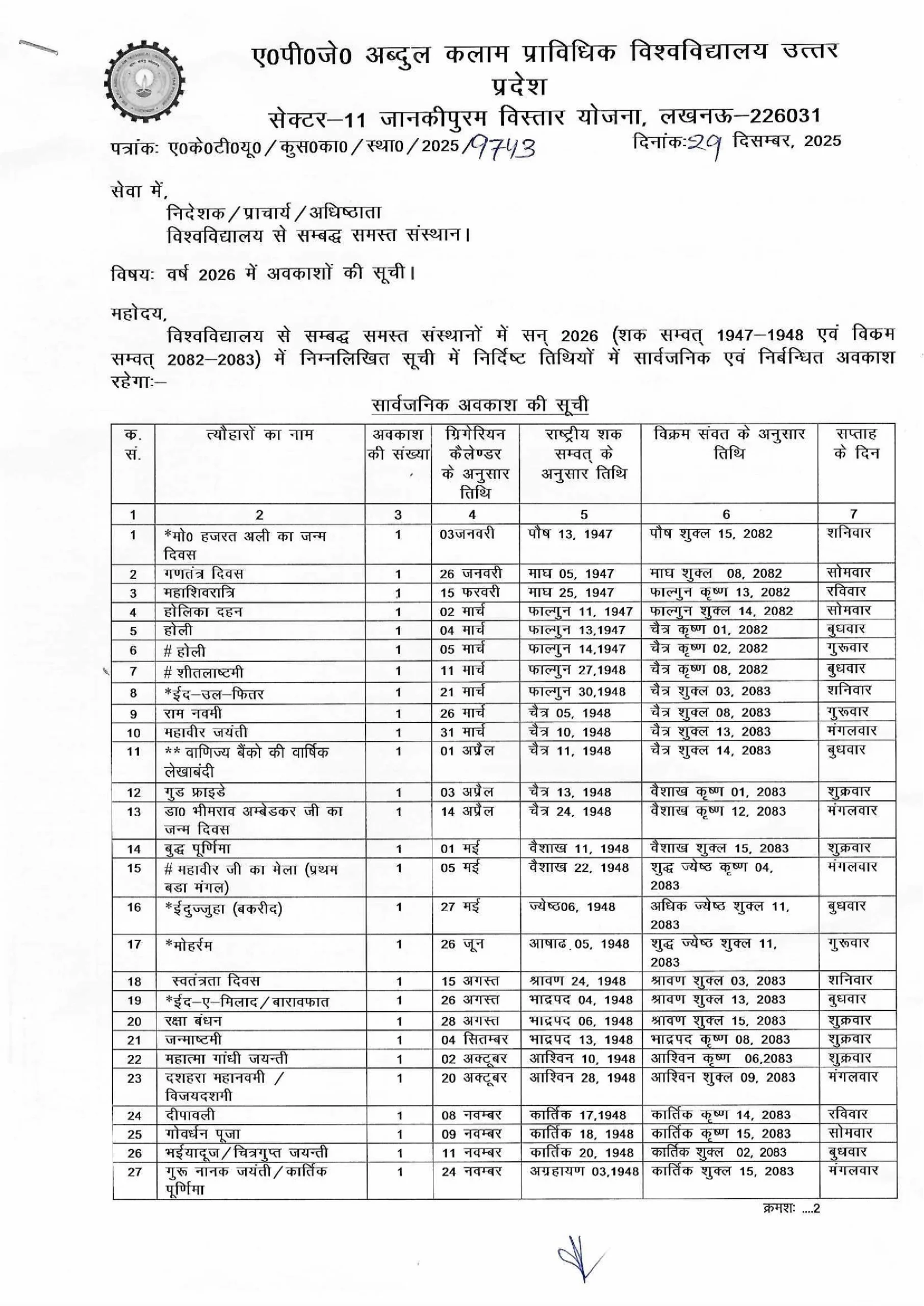 Dr. A.P.J. Abdul Kalam Technical University (AKTU), Uttar Pradesh, follows a well-defined annual holiday structure to ensure smooth academic and administrative functioning. The AKTU Holiday List 2026 provides clarity on public holidays and restricted holidays that will be observed throughout the year.