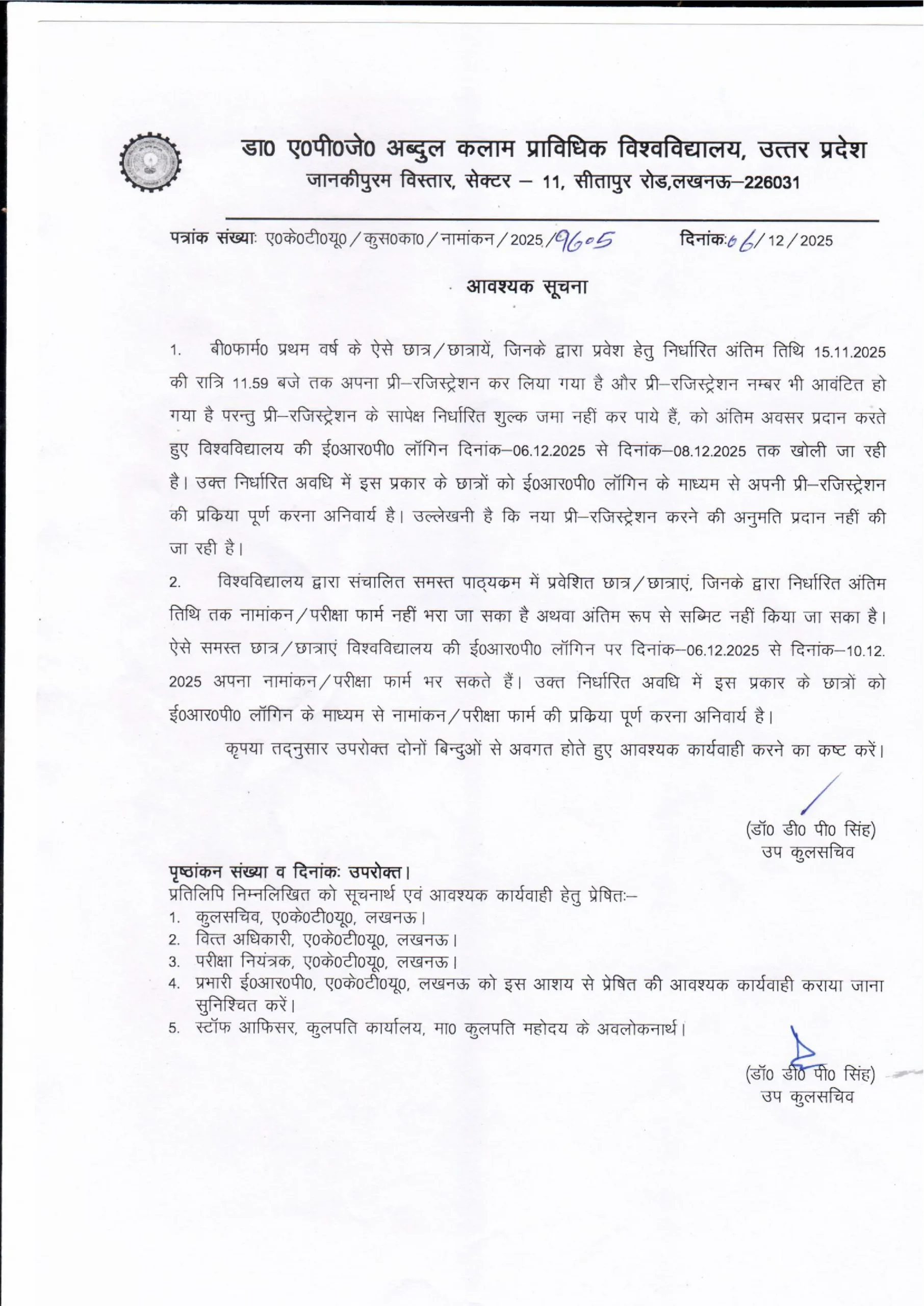 AKTU Important Notice 2025 के अनुसार, वे छात्र/छात्राएँ जिन्होंने 15 नवंबर 2025 रात 11:59 बजे तक अपना प्री-रजिस्ट्रेशन नहीं किया था या शुल्क जमा न करने के कारण प्रक्रिया अधूरी रह गई थी, उन्हें अंतिम मौका दिया गया है।