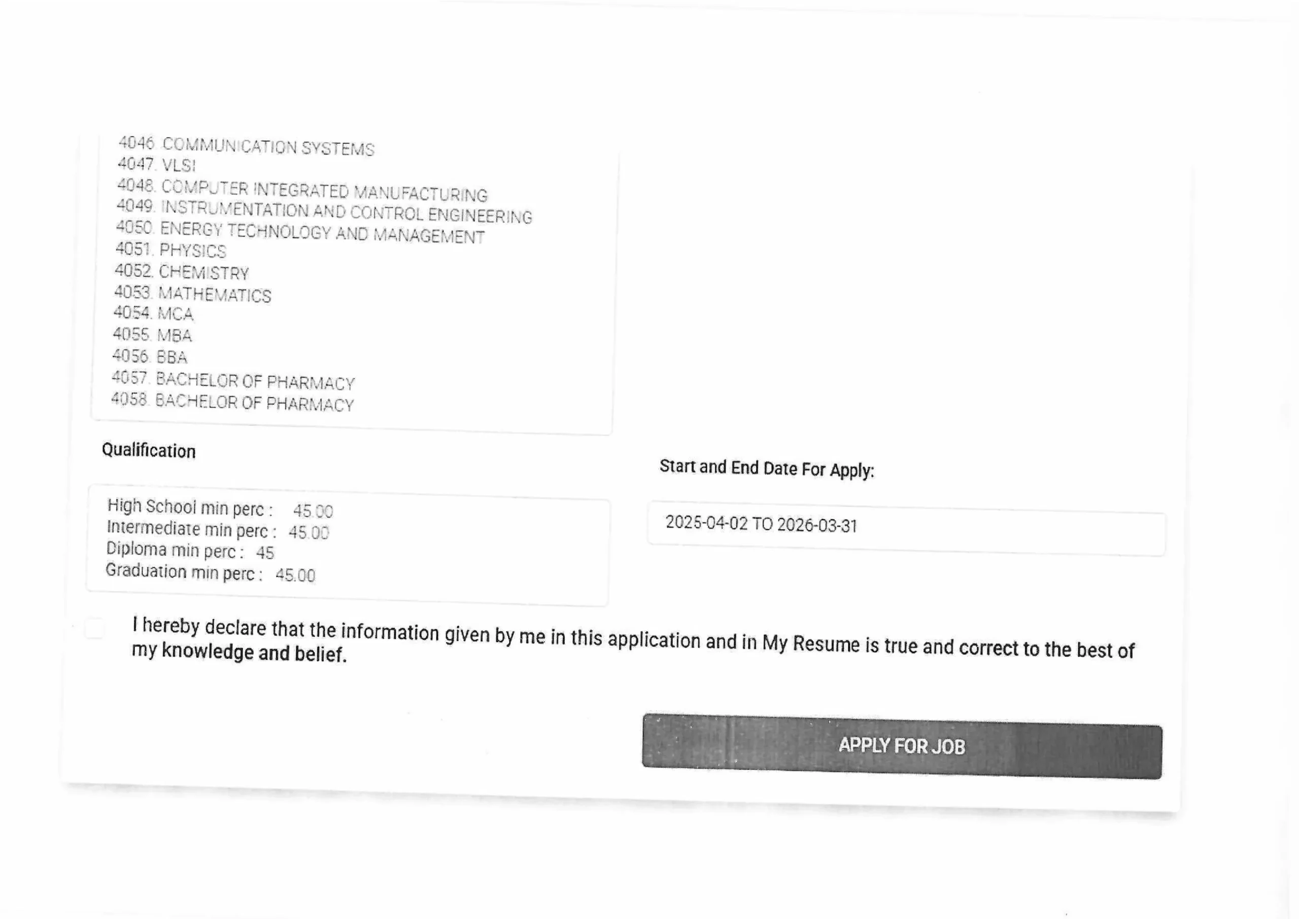 - Minimum marks: 45%–55%