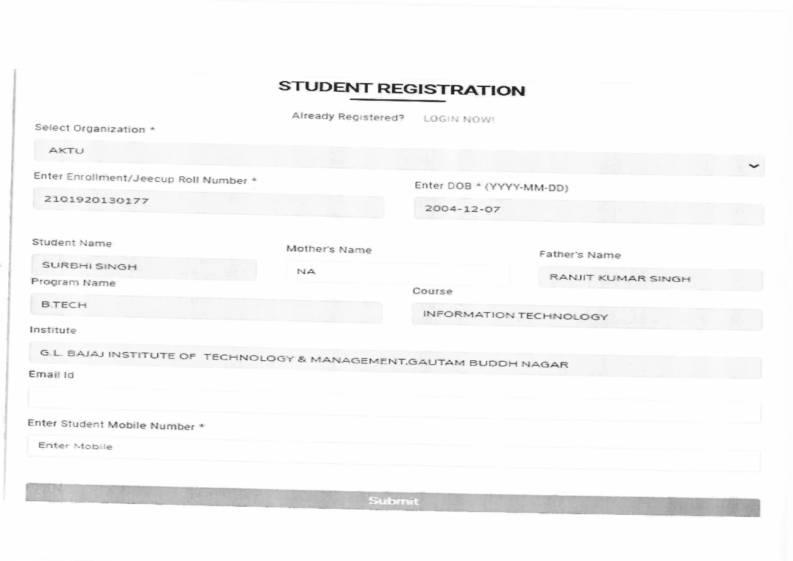 The system will fetch student details automatically such as: