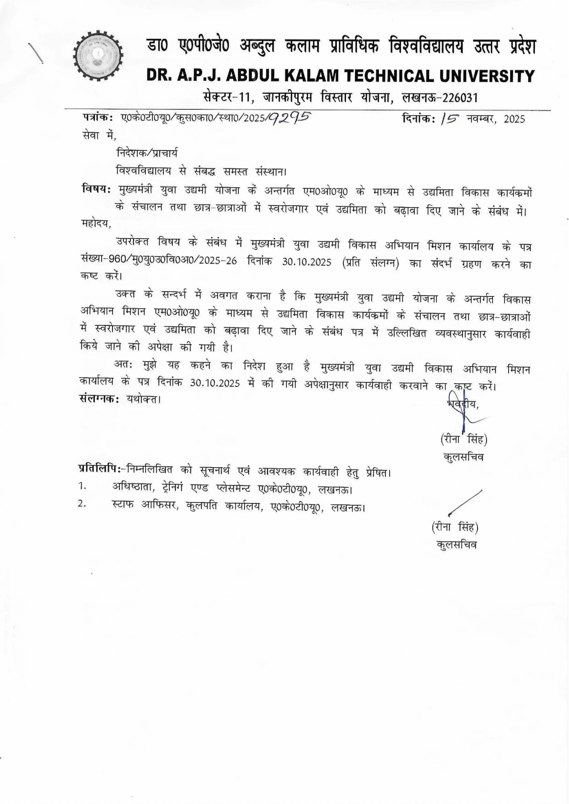 15 नवंबर 2025 को AKTU लखनऊ द्वारा जारी पत्र (संख्या: AKTU/कुस0का0/स्था0/2025/9295) तकनीकी शिक्षा के क्षेत्र में एक बड़ा बदलाव ला रहा है।