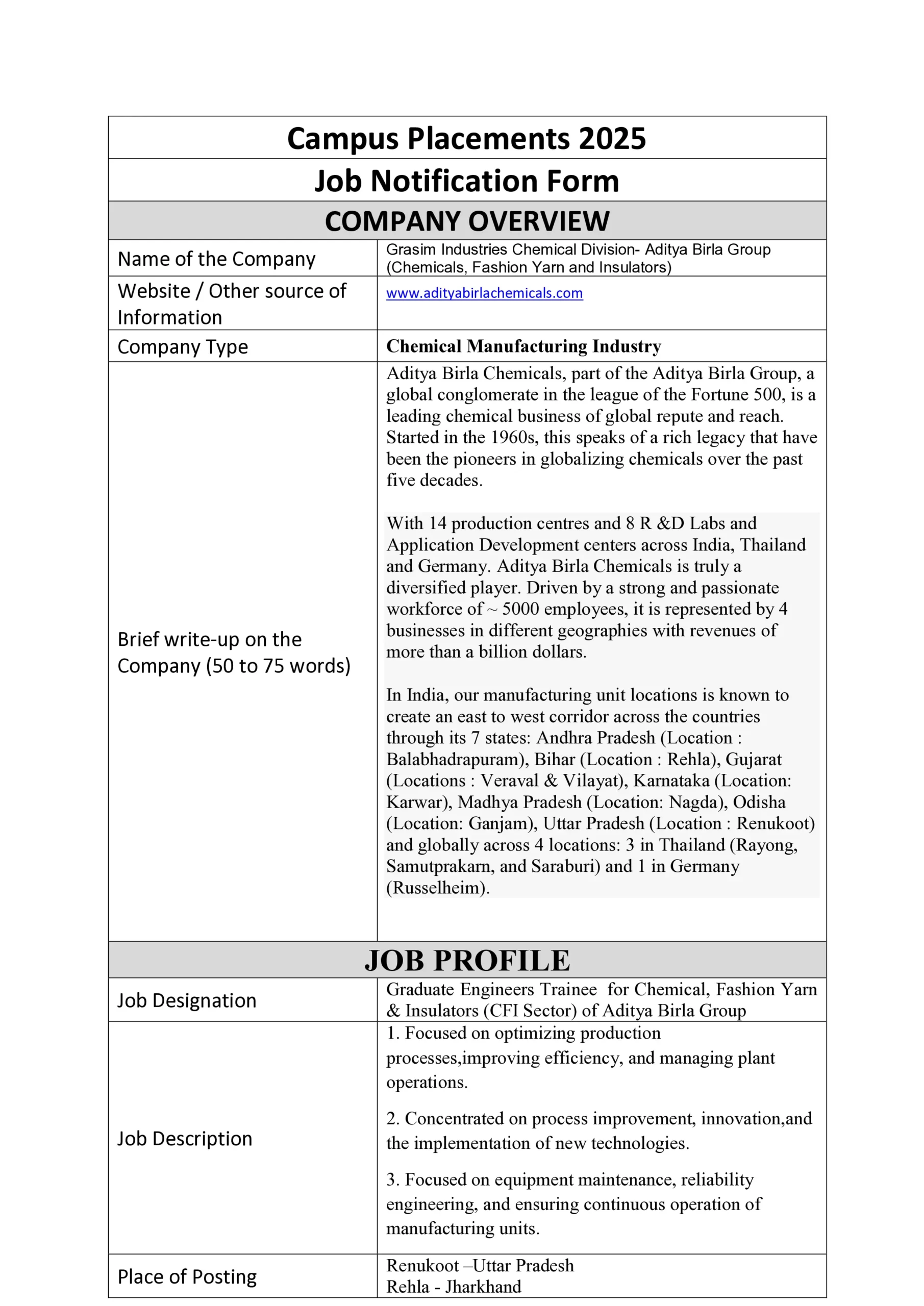 Both locations are major manufacturing hubs of the company. Students applying under Grasim Industries Chemical Division Hiring 2025 must be open to working in plant environments.