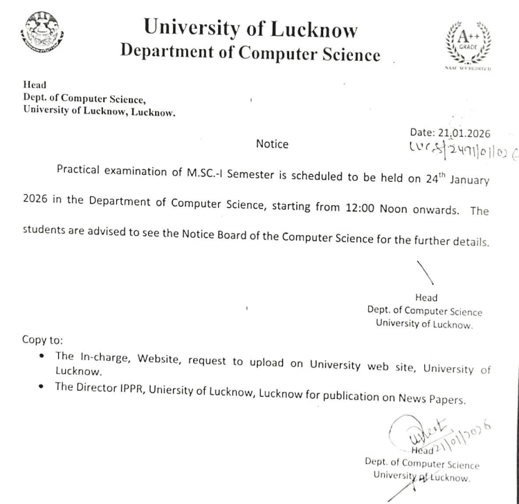 According to the official notice released by the Department of Computer Science, University of Lucknow, the practical examination of M.Sc. First Semester has been scheduled for 24 January 2026. The examination will commence from 12:00 Noon onwards and will be conducted within the department premises itself.