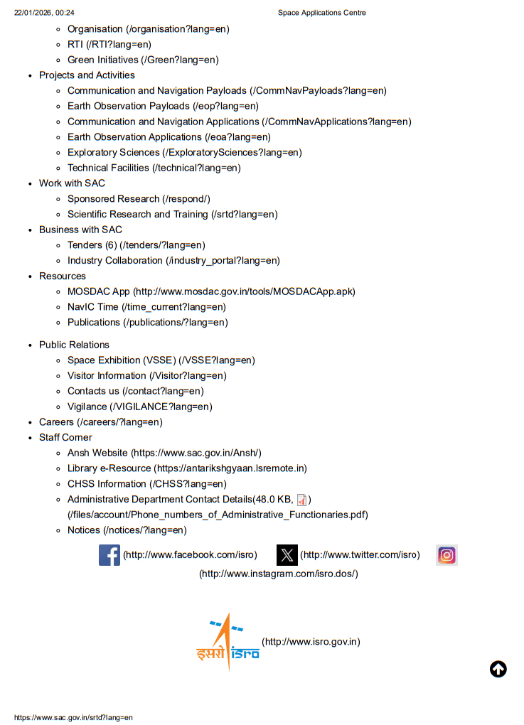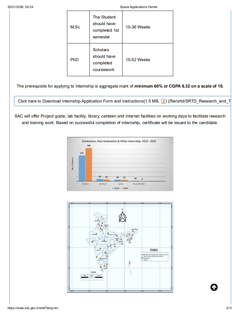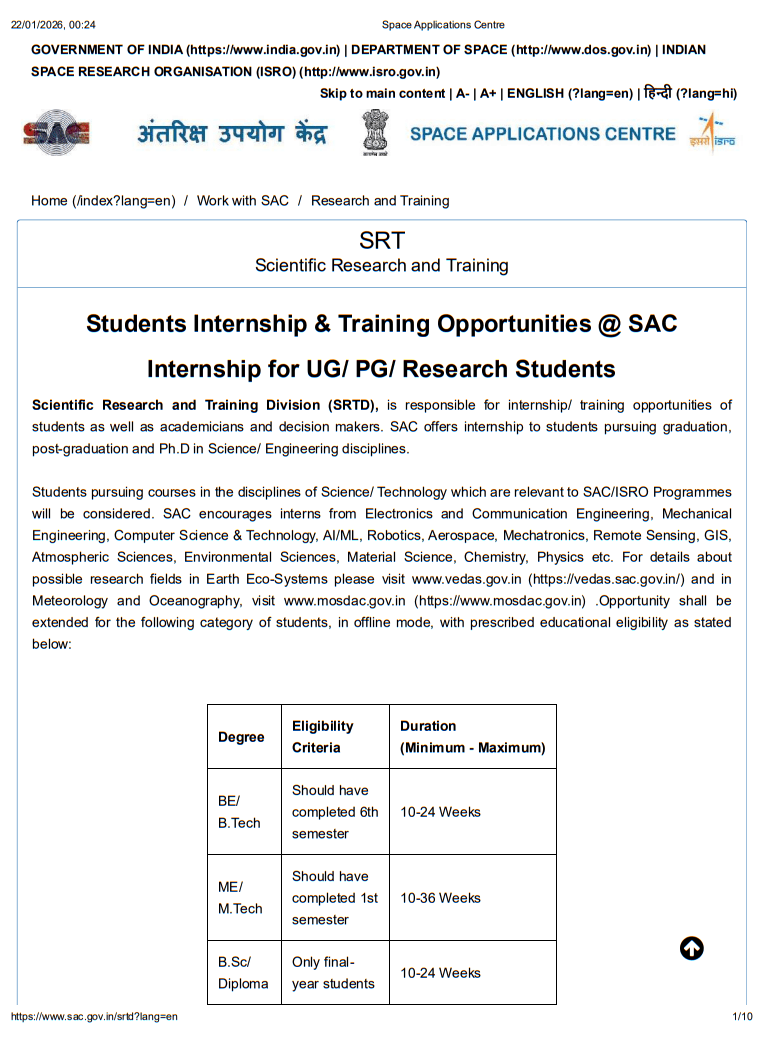 Applicants must be citizens of India and must be enrolled as regular on-campus students in a recognized university or institution. SAC offers internships only to bona fide students for the full duration of the proposed internship or project training.