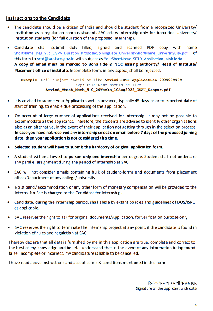 By submitting the application, the candidate confirms that they have read and accepted all terms and conditions related to the opportunity for student participation – ISRO Internship Scheme & Student Project Trainee Scheme.